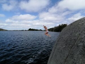 Wieczorem idziemy podziwiać zachód słońca nad jeziorem i morzem jednocześnie. Poznajemy rodzinę miłych Finów, którzy dzielą się z nami informacjami o swoich ulubionych miejscach. Wypijamy razem piwo na skałach, gadamy, wymieniamy kontakty. Jutro kolejny dzień przygody. ⛵
