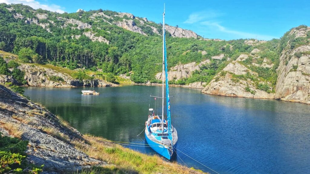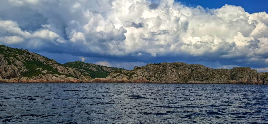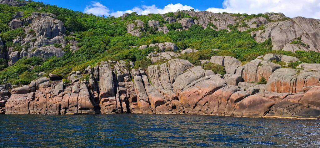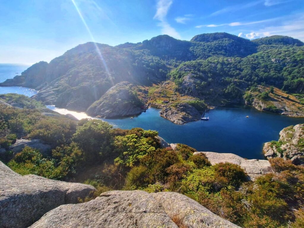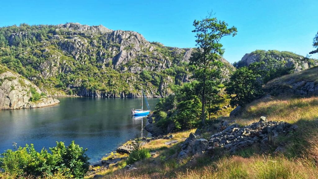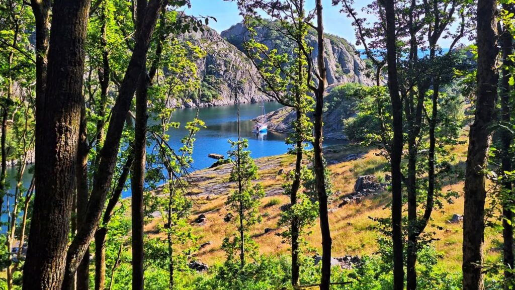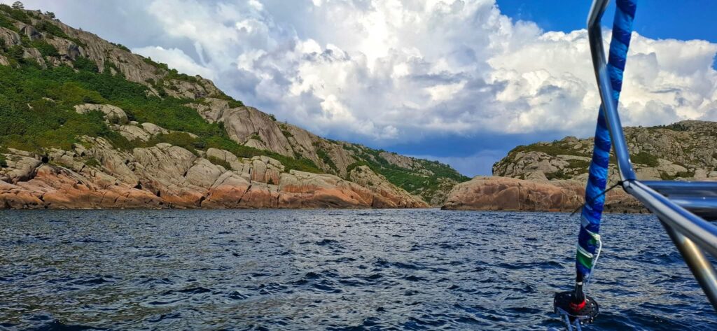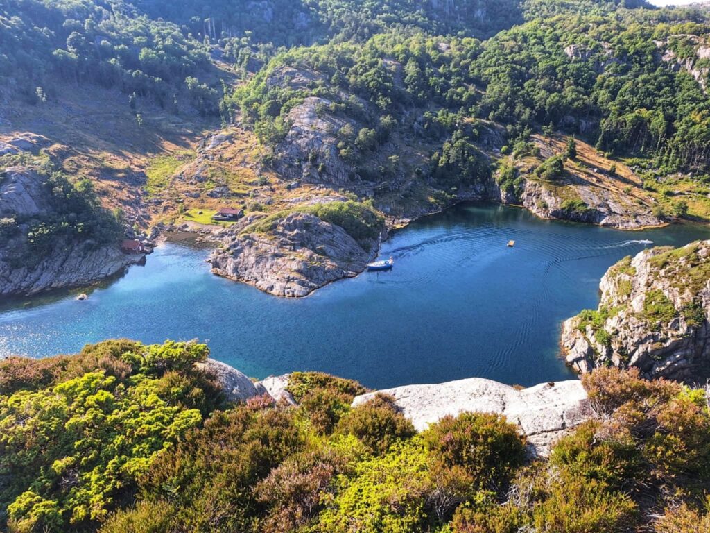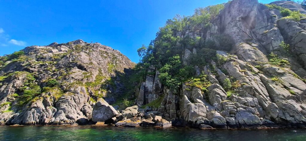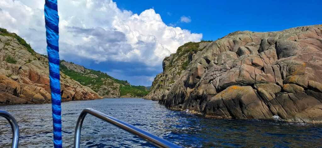 Dziś było jak z Harrego Pottera. Trzeba płynąć cały czas na skałę. Cały czas prosto i się nie bać. Wtedy nagle otwiera się wejście do Ytre Kalvekilen. Wiecie, taka ukryta zatoczka – niczym peron 9 i 3/4. Najpierw przechodzimy przez kanał między wysokimi skalnymi klifami. Jest dość wąsko, ale wystarczająco głęboko. A na końcu kanału jest zatoka. I nie ma nikogo. W końcu to nie jest miejsce dla zwykłych mugoli!Z resztą, popatrzcie sami. P.S. Na ostatnim zdjęciu Szysza w roli naszego drona 😉 Znajdźcie go!
