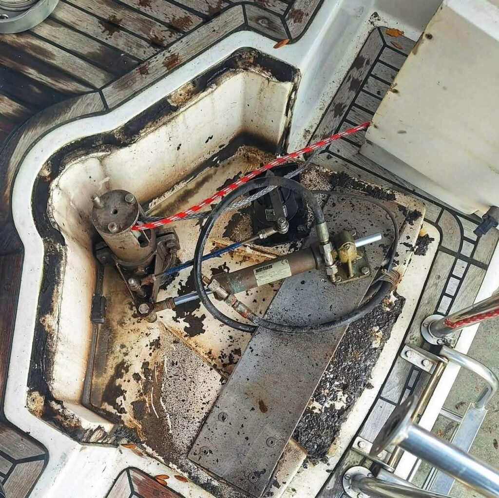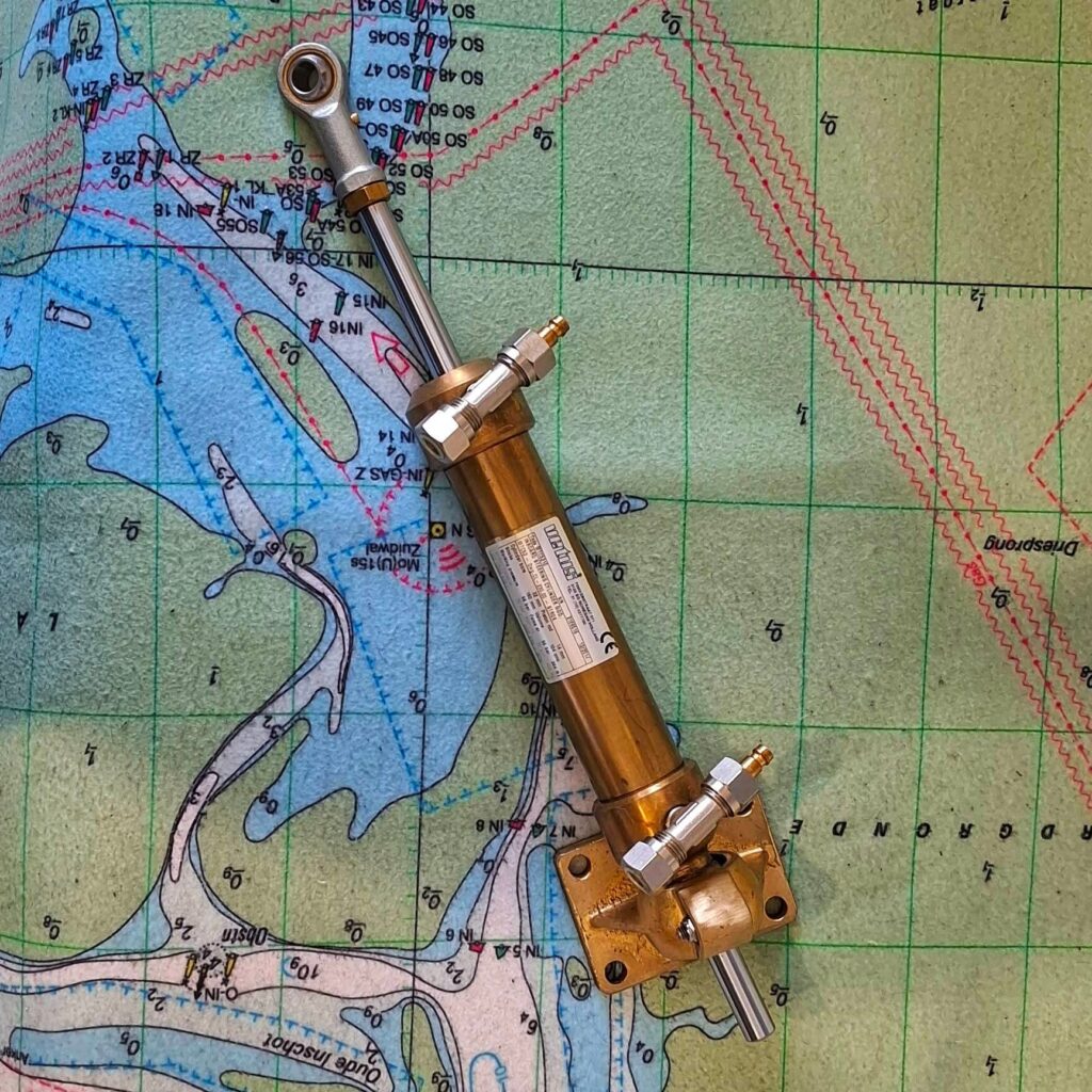 Dziś będzie technicznie. Pod koniec sezonu okazało się, że mamy nieco za mało oleju w układzie sterowania. Na autopilocie wydawało się ok, ale sterując ręcznie konieczne było znaczenie mocniejsze kręcenie sterem. Uzupełniliśmy olej w trakcie wyprawy, mimo to czasem nasz jacht wydawał dźwięk… muczącej krowy.Po wyjęciu jachtu przegląd wiele nam wyjaśnił.Po zdjęciu pokrywy, okazało się, że mamy wyciek oleju z siłownika. Stan przegubu na jego końcu też był tragiczny. Podkładka ślizgowa okazała się nieco wytarta.Na początku był pomysł na dopasowanie przegubu i zakup zestawu nowych uszczelek. Ale w internetach małżonek odnalazł nowy siłownik za rozsądna cenę. Dziś go odebrał. Mamy też już zakupiony teflon na nową podkładkę. 5 i 6 milimetrów. Zobaczymy, która będzie lepsza.